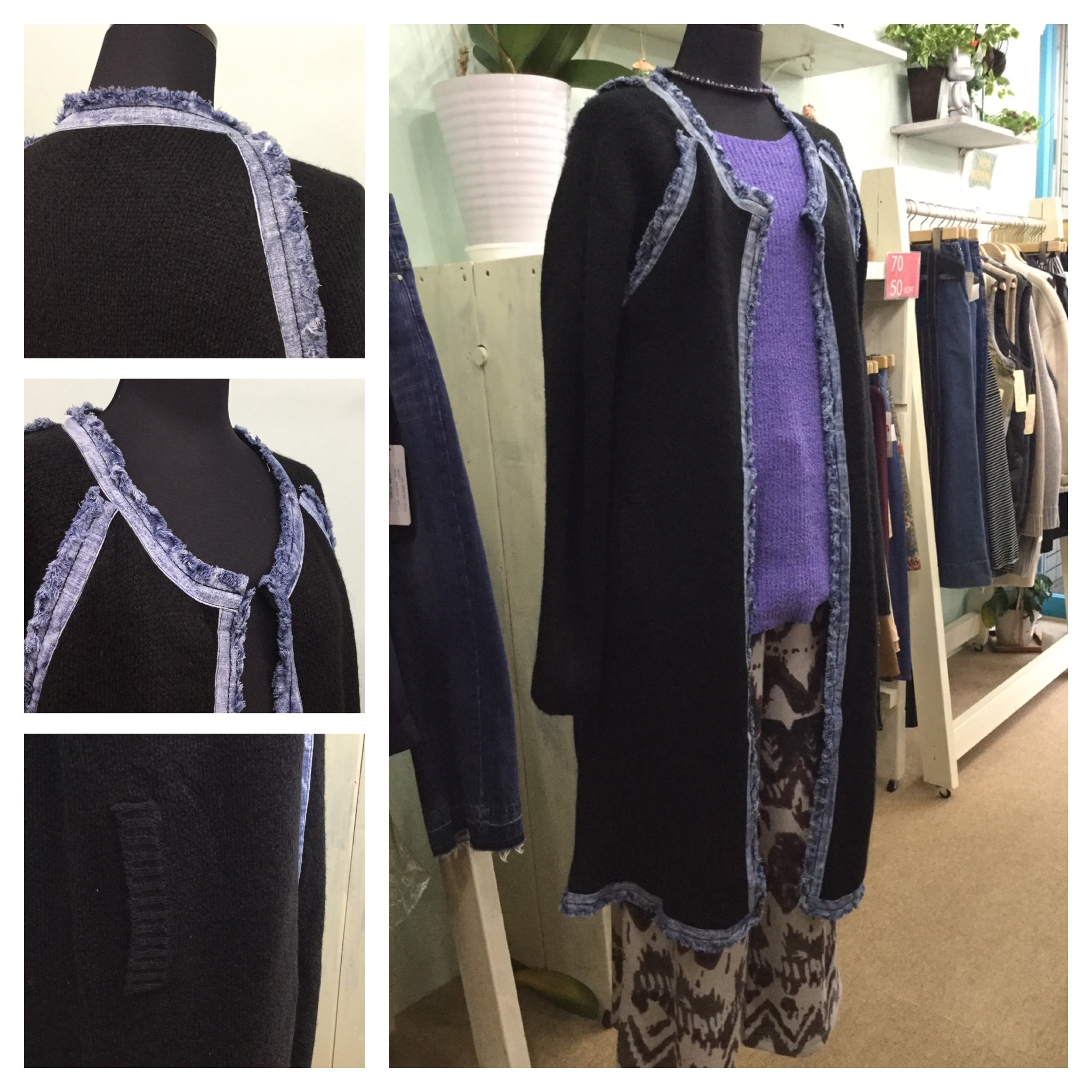 デニムを縁取りしているニットのコーディガンの色違いが入荷しました。